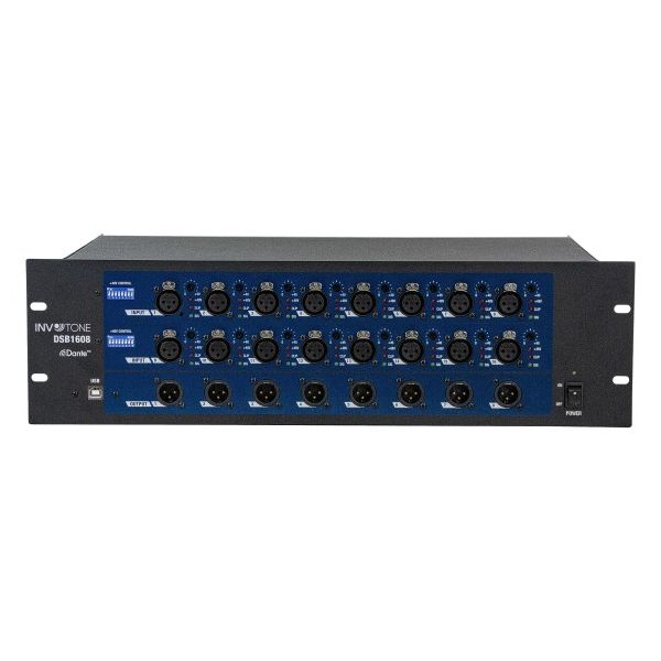 Les boîtiers de scène "DSB" d'INVoTONE remplacent parfaitement les multicore volumineux et compliqués des "temps analogiques". Un boîtier de scène peut le remplacer en le connectant simplement à votre table de mixage numérique avec un câble Cat 5e. Le protocole DANTE est utilisé comme «languuage», ce qui permet une latence la plus faible et une qualité audio la plus élevée. Avec un câble Cat 5e, le signal audio peut être transporté sans perte jusqu'à 100 m. Le "DSB0816" propose 8 entrées et 16 sorties tandis que le "DSB1608" possède 16 entrées et 8 sorties.